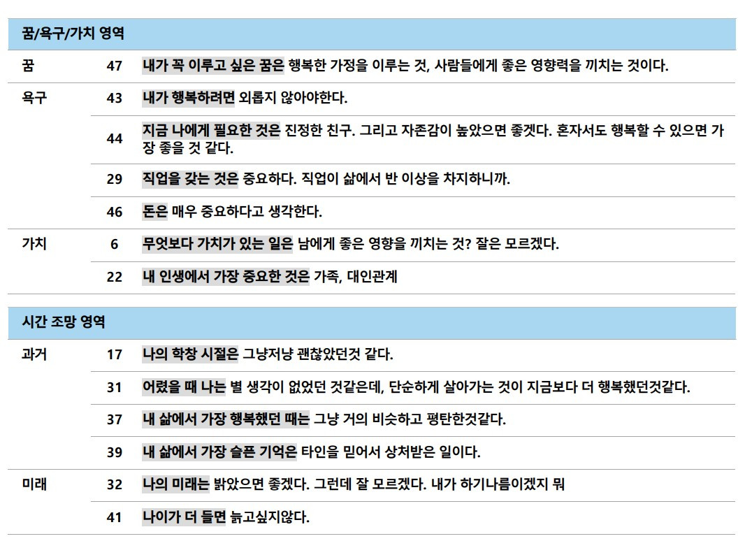 다음 상담이 진행되기 전에 ‘문장 완성 검사’를 미리 해오라는 과제를 받았다. 문장의 앞머리를 읽고 뒤에 빈칸을 채워 넣으면 되는 형식이었다. 영역별로 질문이 꽤 많았는데, 생각나는 것들을 적다 보니 꽤 깊은 내면의 이야기를 하게 되겠구나 하는 예감이 들었다.