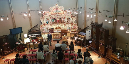 오르골 설명에 귀 기울여 듣는 사람들