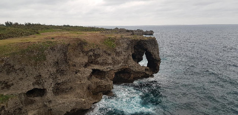 만좌모는 기대가 컸던 곳으로 코끼리 모양의 해안 절벽이다. 산호빛 바다를 끼고 깎아지른 해식애 단면이 독특한 모양을 하고 있다. 안쪽 넓은 잔디밭에는 1만 명이 앉아도 충분하다고 해서 붙은 이름이 만좌모. 단층과 기암, 산호초가 만들어내는 절경을 바라보는데 바람이 너무 세게 불어서 오래 있을 수 없었다..