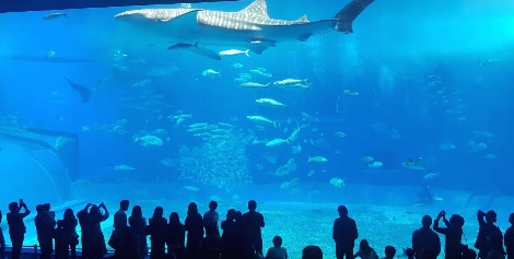 높이 8.2m, 폭 22.5m, 두께 60cm의 '쿠로시오 바다'수조 앞에 서면 크기에 압도당한다. 기네스북에 등재된 최대 규모라고 한다. 수조 안으로 비치는 자연광을 배경으로 유유히 헤엄치는 고래상어의 모습이 환상적이다. 쥐가오리를 비롯한 여러 어종이 한데 어우러져 있고, 매일 신선한 바닷물을 공급하고 있다. 돌고래쇼 관람 후창가에서 점심식사를 하고 있는 데 맞은편 섬과 푸른 바다가 절경이다. 정원에 가꾸어 놓은 꽃들도 아름답다.