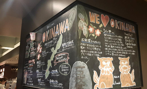국제거리에 위치한 스테이크 한스 하우스에서 이곳의 명물 스테이크로 저녁식사!. 오홍, 미군의 영향으로 철판 스테이크가 유명한 곳이라니 맛을 봐야겠지. 스페셜 메뉴는 250g으로 양도 넉넉하고 샐러드바가 무한이라 마음껏 먹었다. 레스토랑 분위기도 좋았고, 유쾌하게 이야기 나누면서 맛있는 시간을 보냈다. 국제거리 스타벅스 카페에 붙어있는 메뉴가 오키나와 특징을 담았다. 지역의 특징을 담아 만든 그런 점이 매력적이다.