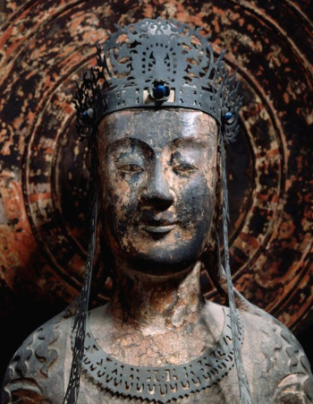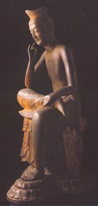 불상과 보살상, 젊은 쇼토쿠 태자상, 고류지를 세운 진하승 부부의 상이 좌우로 정렬한 가운데, 높은 단 위에 목조미륵보살반가사유상이 자리잡고 있다. 내부는 조명을 매우 어둡게 유지하고 있어서 가까이 다가가야 했다. 양옆에 초와 커다란 백합꽃이 공간의 주인공을 알려준다. 높이 123.5cm 고류지 목조미륵보살반가사유상. 석가모니의 고뇌하는 명상자세에서 기원하며, 중생의 구제를 기다리는 미륵보살이다. 실제로 바라보니 고뇌하는 모습을 묘사한 듯 생각에 잠겨있다. 매끈하고 날렵한 몸매가 인상적이었다. 의자에 앉아 불상을 바라보니, 이곳으로 멀리 이동해 온 사람들의 땀과 수고가 한 편의 상상화로 그려졌다. 실존철학자 독일의 야스퍼스가 이 불상을 찬찬히 살펴본 뒤에 크게 감동한 후 남김 말이다. 한 나머지 절찬을 아끼지 않았다.