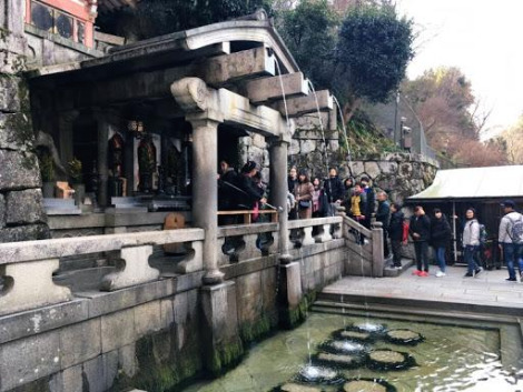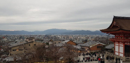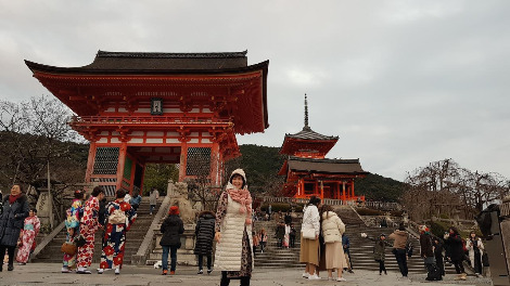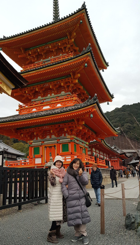 지난해 1월, 혼다 핏을 렌트, 비싼 통행료를 감당하고 교토에 도착하니 벌써 오후 네시, 이번이 세 번째 여행이다. 제일 먼저 찾아간 곳이 청수사였다. 주차장에 도착하니 마감 시간 얼마 남지 않았다고 주차비를 50% 할인해 주었다. 교통비가 몹시 비싼 나라이니얼른 차를 세우고, 마츠바라 거리로 들어서니 사람들이 물결을 이루고 있다. 어여쁜 부채 등 아기자기한 상품들의손짓을 패스하고 청수사로 바로 고고. 기모노 차림의 여행객들이 붉은 빛깔의 건물을 배경으로 인생 샷을 찍고 있다.