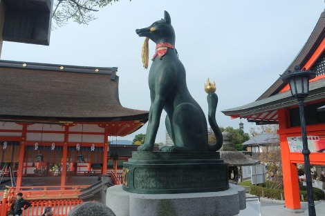 후시미이나리신사는 여우가 신의 심부름을 하는 것으로 알려져 있어 신사 근처에 여우 얼굴을 한 전병 가게도 있다. 신사의 여우상은 입에 실과 실패를 물고 있다. 양잠신을 모시기 위해서 그렇다. 본전은 1499년에 재건한 것으로 중요문화재. 근처 한 쌍의 석등에 둘러싸인 "오모카루돌(おもかる石)"이 있어, 돌을 들어 올렸을 때 가볍게 느끼면 소원이 이루어진다고 한다. 여우 신사답게 내려오는 내내 곳곳에 여우들이 세워져 있다.