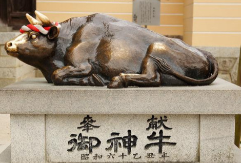 학자 스가와라노 미치자네가 죽은 지 16년 뒤, 919년에 텐만구 신사가 세워졌다. 국보를 전시하는 보물관과 스가와라노의 일생을 하카타 인형으로 전시하고 있는 기념관이 있다. 큼지막한 황소가 앉아있는 고신규 조각상이 반겨주었다. 스가와라노가 죽은 후 그의 시체를 옮기던 소가 이곳에서 꼼짝하지 않고 멈추자 그곳에 신사를 지었다는 전설에서 비롯되었다. 텐만구 신사 안에는 모두 11개의 고신규가 있다. 고신규의 머리를 쓰다듬은 뒤, 그 손으로 자신의 머리를 쓰다듬으면 머리가 좋아진다는 속설이 있어서 황소의 머리는 참배객들의 손길로 반질반질하게 빛이 난다.