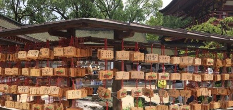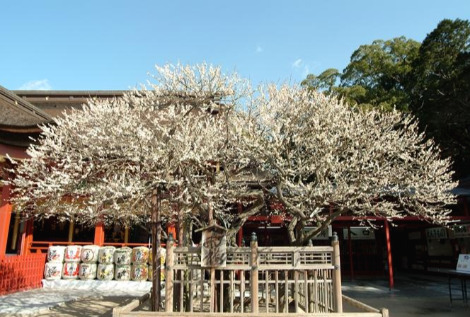 신사마다 참배하기 전에 손을 깨끗하게 씻는 히사쿠와 커다란 매화나무 도비우메가 있다. 일본 전 지역에서 가장 먼저 매화가 피어나며, 6천여 그루의 매화꽃이 피어난다. 좌천된 스가와라노 미치자네를 안타깝게 여긴 한 노인이 매화 가지에 떡을 꽂아 건네준 것이 변해 지금의 우메가에 모찌. 입구에서 맛나게 먹었던 매화모찌이다.