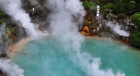 시바세키 지역의 치노이케 지옥은 짙은 붉은색으로 피의 지옥으로 불리는 곳이다. 다쓰마키 지옥은 소용돌이 지옥으로 30~40분마다 솟아오르는 간헐천이 유명하다. 원천의 함유물질에 의해 파란색, 빨간색, 흰색 등 온천수 색이 다양한 벳부의 온천은 국가명승으로 지정되어 있다. 지옥 온천 열을 이용하고 악어를 기르는 오니야마 지옥도 특이하고, 연고, 온천 계란, 입욕제품 등 기념품을 살 수 있다.