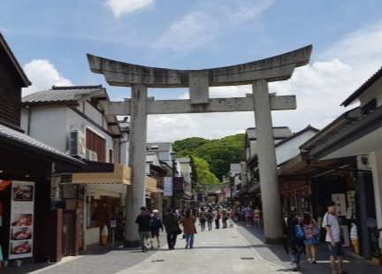 안으로 쭉 들어가면 신사 입구에 세워진 도리이를 만나게 된다. 도리이는 신과 인간을 이어주는 전령사, 우리의 솟대와 유사하다. 소도에 세워진 솟대처럼 질병과 재앙이 없기를 기원하는 염원이 담겨있다. 도리가 석조물이라 오히려 근면함이 느껴진다.