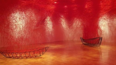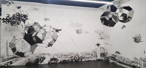 에스컬레이터를 타고 54층으로 올라가니 1996년부터 베를린에 거주하면서 활동하는 일본의 설치 미술가 시오타 치하루의 작품이 전시 중이었다. 실로 연결된 자신의 감정이 표현된 듯한데 온통 붉고 또 붉다. 과거와 현재, 삶과 죽음, 사물에 심어진 기억의 관계를 탐구하기 위해 거미줄 같은 검은색과 붉은색의 실을 삽입했다. 붉은 실에 매달린 트렁크의 떨림이 여행 전의 설렘으로 표현되었다. 기억과 침묵의 지난 시간들이 집과 창문, 실 탈래 속에 담긴 듯했으나 그의 조형세계는 일반적이지는 않았다. 작품에서 표현하는 색채가 너무 붉고, 강한 느낌이었다. 2020년 2월 부산 시립미술관에서 영혼의 떨림이라는 주제로 또 전시되고 있었다. 개인적으로 베를린에서 작품 활동을 하는 토마스 사라세노의 인터렉티브 아트, 거미줄처럼 연결된 사회망을 표현하는 것이 취향에 맞다. 담백하면서도 입체적인 네트워크 연결망을 멋지게 표현한 작가라는 생각이 들었다.