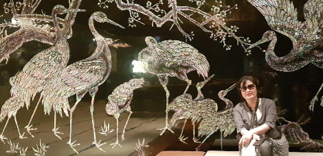나전칠기로 구성된 전용복의 작품 송학도 앞에서