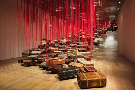 시오타 치하루의 붉은 실에 매달린 여행가방