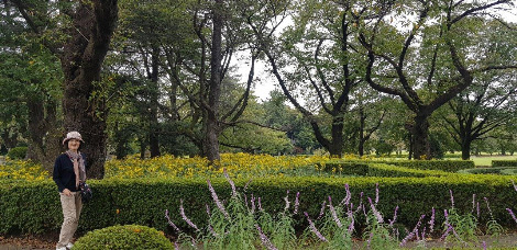황실 정원이 1,949년 도심 숲 공원으로 되었으며, 넓이 58.3만㎡, 둘레 3.5km의 광대한 규모이다. 장미와 예쁜 꽃들로 우아한 프랑스식 정원을 지나 푸른 잔디밭이 돋보인 영국식 정원, 부근 디아모 연못을 둘러보고 유리로 된 온실로 들어갔더니 다양한 식물들이 자라고 있다. 이 온실 설계자가 창경궁 온실도 설계했다 한다. 아름답고 우아하여 도시민의 쉼터가 되는 신주쿠 공원에 1,000 그루가 넘는 벚꽃 나무가 있어 봄이 되면 분홍빛으로 물들인다고 한다. 신주쿠 공원을 뒤로하고 고쿄와 히비야 공원 쪽으로 이동.