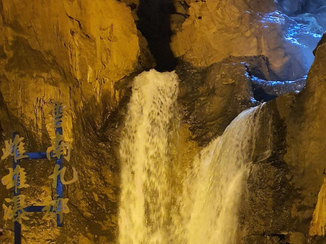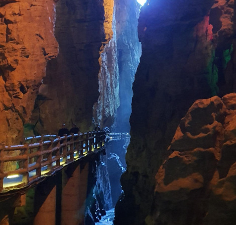 동굴 입구 계곡의 높이가 50m에 달하는 협곡이 장관이었다. 집선곡이란 깊은 협곡을 거쳐 동굴 구간 투어를 시작하였는데, 협곡에서 흘러내리는 강물의 위세가 대단하다. 협곡을 지나 동굴 입구인 고하천동이란 곳에 들어서자마자 중국 특유의 화려하고 빛나는 갖가지 색채의 조명이 동굴을 밝히고 있었다.