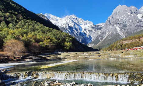 폭포와 백수대를 흉내 내어 만든 계단식 석회암 층 위로 흘러내리는 백수하에 도착했다. 융설수 맑은 수면에 비친 옥룡설산의 모습은 한 폭의 동양화이다. 옥룡설산과 하늘, 구름이 반영된 호수를 바라보니 석회암 기반암 위에 하얗고 푸른 호수가 만들어진 크로아티아의 플리트비체가 생각났다. 옥룡설산에서 흘러내리는 옥빛 물을 모아 계단식 인공구조물을 만들어 이색적인 풍경을 연출하는 백수하의 아름다움을 느꼈다. 신전 같은 구조의 계단식 모형이 인공물이라는 사실을 늦게 알았다.