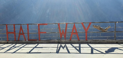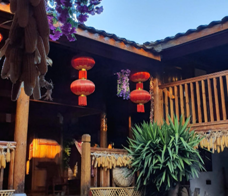 졸거나 멍하니 걷다가 아차 하면 굴러 떨어질 낭떠러지 길을 가는 말 등에 차를 담고 다녔을 사람들이 중간중간 쉬었을 중도 객잔에 도착했다. 하프웨이, 나무로 이어놓은 hal fway라는 글귀가 옥상 난간에 걸려 있는데 햇빛 받아 빛나고 있다. 옥수수를 말려 널어놓은 것을 보니 산골마을이다. 나무로 만든 집과 세상에서 가장 멋진 경치를 가진 화장실은 아직도 기억에 난다. 호도협 트레킹 후 이층 옥상에서 햇살을 받으며 편안하게 흔들의자에 앉아 힐링타임을 가졌다. 이후 점심으로 중도객잔에서 맛볼 수 있는 별미, 오골계 백숙, 감자튀김 등은 한국인들 입에 맞고, 기타 반찬도 맛있게 먹었다.