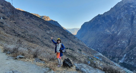 아침 8시에 트레킹을 시작하니 햇빛이 사선으로 들어와 눈이 부시고 높은 봉우리에는 황금빛이 투영되었다. 당나귀에 차와 비단을 싣고 부지런히 다녔을 옛사람들이 생각났다. 지금도 나귀 코스가 있지만 차마 객잔에서 중도 객잔까지 도보로 트레킹을 했다. 상쾌함 가득 담아 걷는 산비탈 좁은 길들이 멋지고 환하게 트여있어 걷기에 참 좋았다. 저 아래 굽이치는 호도협의 물줄기가 보였고, 멀리 하얀 합바설산이 이정표처럼 보였다.