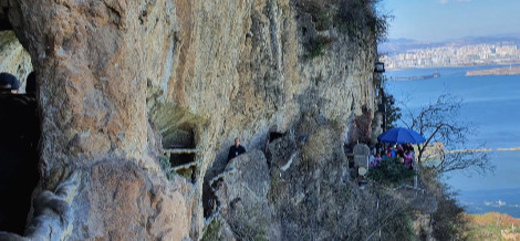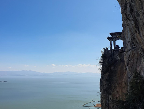 리프트카에서 내리니 두 사람이 겨우 비껴갈 수 있는 좁은 길이 이어졌다. 아찔한 낭떠러지 바로 옆에 꽈배기처럼 생긴 난간이 서있다. 곤명 공항 2층 유리창에서 만난 리본 모양이 바로 여기, 서산의 상징이었구나! 좁다란 산기슭 한쪽에 정자가 서있기도 하고, 군데군데 석굴 안에 불상이 모셔져 있기도 했다. 조그만 석굴 안에 향불이 피어오르고, 사람들은 기도를 하러 몰려들고 있었다. 중간중간 내려다보면 완전 수직 절벽이 보이고, 저 아래에는 곤명호가 수평으로 서산을 감싸고 있었다.