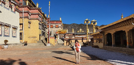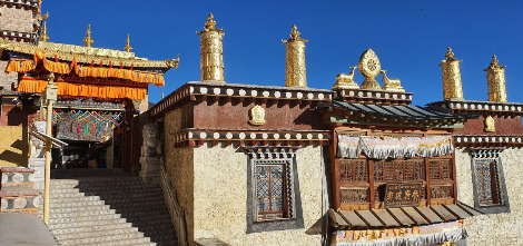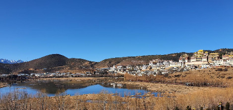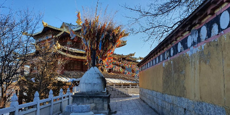 마을 길을 따라 신의 호수라고 불리는 라무양춰 호수에 닿으면 중앙에 작은 포탈라라고 불리는 송찬림사가 있다. 마을의 가장 높은 곳에서 금빛 찬란하게 빛나는 절은 1681년에 준공된 윈난성 최대의 라마교 사원이다. 수십 마리의 까마귀가 황금빛 사원 위를 날아드는데 인근에 천장 터가 있어서 마치 죽은 자의 영혼을 사원으로 데려오는 듯하다.
