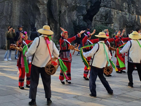 셔틀을 타고 먼저, 대석림을 들어갔는데 전망대까지 사람들이 넘쳐 사진을 제대로 찍기 힘들었다. 너무 넓어 다 볼 수 없어 일정 구간만 잡아 빠르게 움직였다. 바위 모퉁이를 돌면 소수민족 사람들이 곳곳에서 민속악기를 연주하고, 춤을 추고 노래하고 있었다. 드디어 전망대에 올라 광활한 카르스트 지형을 둘러보니 그야말로 숲이었다. 햐~~ 자연의 위대함이란 이런 거구나!! 내려오는 길에 만난 넓은 광장에서는 관람객과 함께 소수 민족 남녀들이 전통춤을 추는데 단순한 가락과 몸짓이었다. 여행객들도 같이 춤을 춰서 나도 포크댄스처럼 함께 춤을 추었다. 한 발 성큼 그들의 세계로 들어간 기분이었다. 그 지역 사람들의 문화를 직접 체험해보는 것도 여행의 한 즐거움이다.