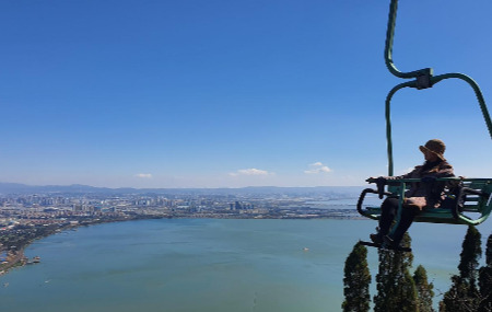 셔틀버스를 타고 리프트카를 타기 위해 이동하는데 언뜻언뜻 곤명호가 보인다. 리프트카 정류장까지 가는 길에 햇살은 따뜻하게 빛나고 있었고, 사람들은 여유롭게 이 길을 걸어 서산을 오르고 있었다. 친구와 함께 엉성한 리프트카에 올라타고 한참을 올라가는데 발아래 호수가 넓게 펼쳐졌다.