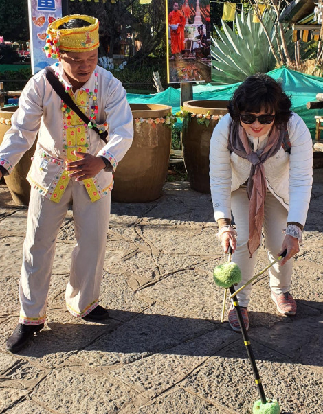 묘족 마을 입구에서 은장식을 한 전통복장의 여성들이 서있었다. 둥근 모자와 둥근 치마를 입은 부족의 복장이 참 예뻤다. 마을 입구에 세워진 대문 아래에는 말린 옥수수와 발효 중인 술독이 보였다. 붉은 천으로 항아리를 묶어놓았다. 묘족은 명랑하고 낙천적인 민족이라는 느낌이 들었다. 프랑스 선교사에 의해 서양 종교를 받아들여 예배당이 마을 한쪽에 자리 잡고 있다. 우산으로 장식된 태족마을, 호수를 끼고 치앙마이에서 볼 수 있는 코끼리 경기와 태국에서 볼 수 있는 가옥구조도 있다.