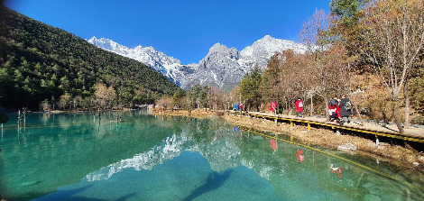 조금 아래쪽으로 내려가면 푸른 달빛이 머무는 호수가 나온다. 쪽빛 수면으로 역시 수면에 반사된 설산의 모습이 아름답다. 마치 구채구 같다. 옥룡설산의 눈이 녹아 흐르는 계곡물에 비친 달빛이 푸르다 하여 람월곡으로 불린 곳이다. 달빛이 머무는 쪽빛 호수라는 람월곡 이름 참 잘 붙였다.
