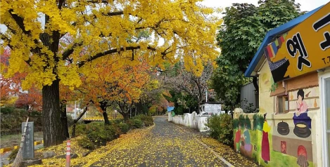 옥산서원 가는 길에 만난 세심마을에도 가을이 가득 담겨있었다. 마을 입구의 크고 오래된 은행나무는 진입도로마저 노랗게 물들였고, 담장은 알록달록 옛 모습의 벽화로 채워져 있다. 벽화가 그려진 옛고을 식당에서 간장 게장으로 점심을 먹었는데 맛이 일품이었다.