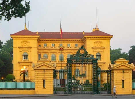 주석궁 외관은 노란색이며 식민지 시절 총독부로 쓰였던 곳이다. 국빈 방문 시에만 열리는 철문을 지나 노란 석회가 칠해진 화려한 건물은 현재 주석의 관저로 쓰이고 있다. 호찌민이 국가 주석으로 재임 시절, 정원사의 집을 관저로 사용하고 주석궁은 업무 보는 사람들이 사용하도록 했단다. 이 건물은 대칭적으로 설계되었으며, 가운데에는 큰 블록이 있고 측면에는 두 블록이 있는 유럽풍의 건물이었다. 각 방마다 다른 장식이 있는 30개의 방으로 이루어졌으며, 인도차이나에서 지어진 가장 큰 건물 중 하나이다. 이 지역의 유일한 베트남 특성이 보이는 것은 요소는 주변 정원에서 자라는 망고 나무들.