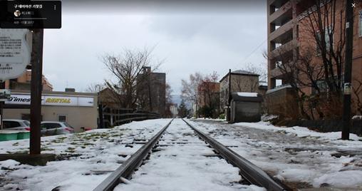 춥기도 하고 어두워지려 해서 주오거리를 따라 오타루 역으로 돌아가는 길, 오타루 문화센터 앞에 테미야 라인 기찻길이 보였다. 홋카이도 최초의 철도가 폐선이 되어도 선로나 역의 일부가 남아 있고, 가볍게 선로 위를 걸을 수 있다.