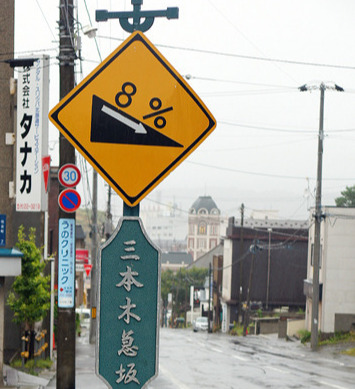 다시, 왼편으로 500미터 정도를 걸어 세 그루의 큰 나무에서 유래했다는 산본기 비탈을 걸어가는데 크게 가파르지 않았다. 눈이 오면 언덕을 오를 수 없었던 이곳을 메이지 시대에 2회에 걸쳐 경사를 낮춰주었다고 한다. 도로표지판에는 급경사라고 되어있는데 표지판 위에는 경사 8도라고 표시되어 나름 재미있는 곳이다.