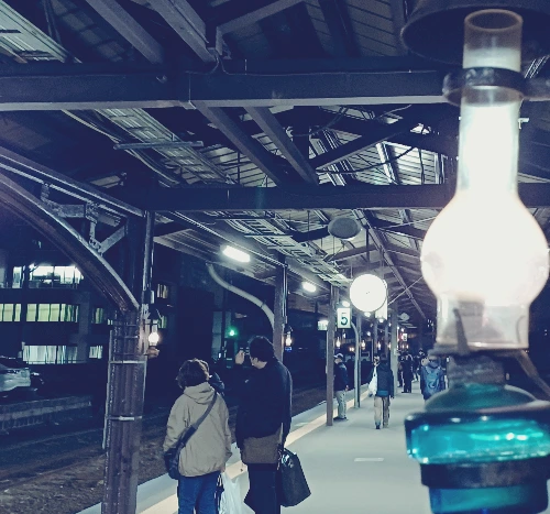 플랫폼에 들어서니 나의 마음을 사로잡은 것은 바로 역의 플랫폼에 세워져 있던 가스등! 유리병 램프에 불이 켜져 은은하게 다가오는 가스등의 향수. 그 추웠던 겨울을 감싸주던 뮌헨의 가스등 켜진 밤거리를 생각나게 했다. 감성에 젖어 옆에 있던 일본인에게 부탁해서 플랫폼 가스등을 배경으로 사진 한 장 찍을 수 있었다.