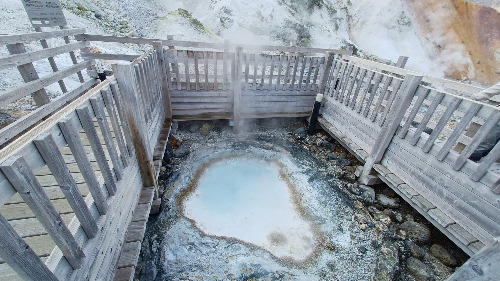 데크 산책로 따라 쭉 들어가면 지옥계곡 중앙쯤에 텟센이케를 볼 수 있다. 철이 샘솟는 작은 연못의 의미를 가진 텟센이케는 약 80도 정도로 뜨겁기 때문에 위험하여 나무 벽을 둘러놓았다. 간헐 용천하는 샘을 가까이서 볼 수 있는 것만도 좋았다. 온천 빛깔도 하늘을 담고 있어서 더욱 예쁘게 보였다.