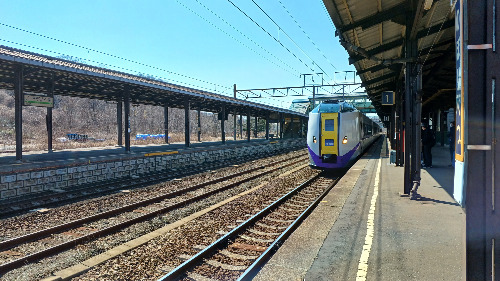 활화산 윗부분에 도움형태가 나타나는 독특한 다루마에 산은 시코쓰호 남쪽, 1,041미터 높이다. 머리 하얀 설산이 기차를 따라온다. 40분 정도 남으로 달리던 왼편 창가에 파란 바다, 태평양이 눈에 들어왔다. 오른쪽에는 다루마에산과 토마코마이 시가지 일부가 보인다. 이제부터 기차는 바다를 끼고 서쪽으로 향한다.