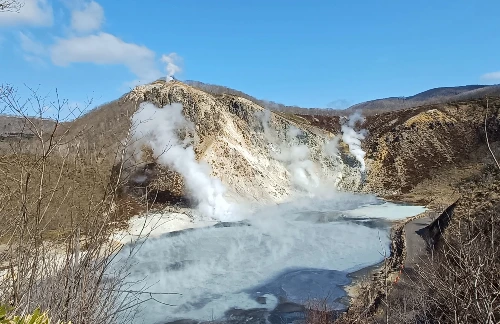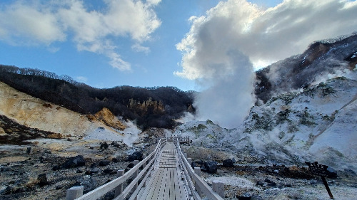 보도 옆을 흐르는 오유누마강은 하얗고 혼탁한 김이 피어오르고 있었다. 아이누어로 노보르베츠는 하늘색의 짙은 강이라는 뜻이 있는데 노보리베츠 지명의 어원이 되었다고 한다.