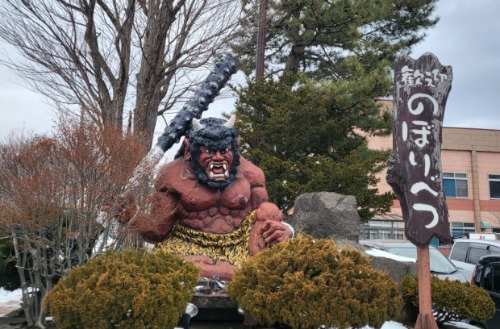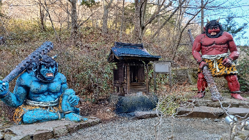 유명한 온천지역답게 제법 사람들이 많다. 검표 역무원을 지나 역사 내부로 들어오니 도깨비 조각상이 세워져 있다. 남녀 도깨비의 생김새가 귀엽다. 역사 외부에는 빨간 도깨비 오니가 송곳니를 보이며 눈을 치켜뜨고, 방망이를 머리 뒤로 들고 앉아있는 모습이 으스스 무섭다.