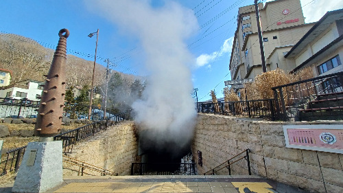 지옥계곡을 올라가는 길에 크렁크렁하는 소리가 들려와 주위를 둘러보니 색색의 도깨비방망이가 빙 둘러 서있다. 센켄 공원 계단 아래로 내려가니 매퀘한 냄새와 유황 연기가 펑펑 용출하다 말다를 반복하고 있다. 잠시 지옥을 실감할 수 있는 이곳은 온천수가 용출하는 곳이다.