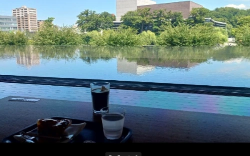 아키타를 찾은 가장 큰 이유는 바로 아키타 현립미술관! 미술관에 들어서자마자 바로 2층으로 올라가는데 계단 구조가 세모 모양이다. 기존 미술관의 삼각형 지붕을 모티브로 삼아 디자인했다. 차와 쿠키를 주문하고 창가 1열에 앉았다. 냉방기 영향이 있겠지만, 시야가 더욱 시원한 공간이다. 그림 같은 풍경, 만나고 싶었던 공간이 눈앞에 펼쳐진다. 공간을 즐기고, 여유를 부리면서 창 너머 한계를 벗어나는 사색의 시간이다.