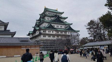 지하철 시청역 7번 출구에서 3분 정도 따라가면 나고야 성 입구로 들어가게 된다. 나고야성은 오사카성, 구마모토성과 함께 일본 3대 명성이다. 오다 노부나가의 전국 통일 거점으로 축성 시기는 모모야마 시대, 오다 노부나가 전국 통일부터 임진왜란까지 40년 정도 시대를 말한다. 쇼군이 강조되고, 장대함과 호방함이 추구되며, 진한 채색과 금박을 사용하는 특징이 있다.
