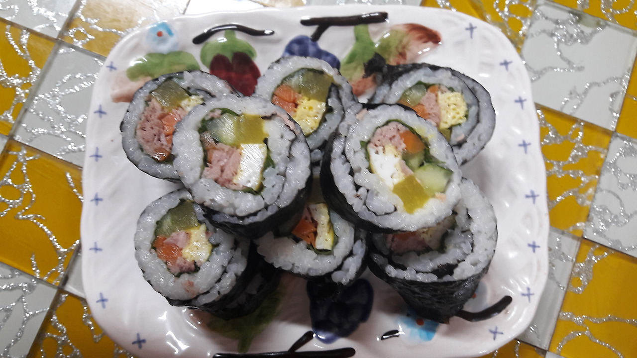 일기예보에 비소식이 있었지만, 다행히 오후부터 내린다 해서 일단 가슴을 쓸어내렸다. 초밥과 김밥중 고민하던 아이에게 참치김밥을 싸주기로 했다. 갓지은 고슬고슬한 밥을 김위에 고루 펴놓고,깻잎,계란지단,오이,당근,참치, 단무지등을 취향껏 엊으면 된다. 최대한 동그랗게 말아야 한다. 밥은 적당히 식히는게 좋다. 잘못하면 옆구리 터진 김밥이 될수 있기 때문이다.