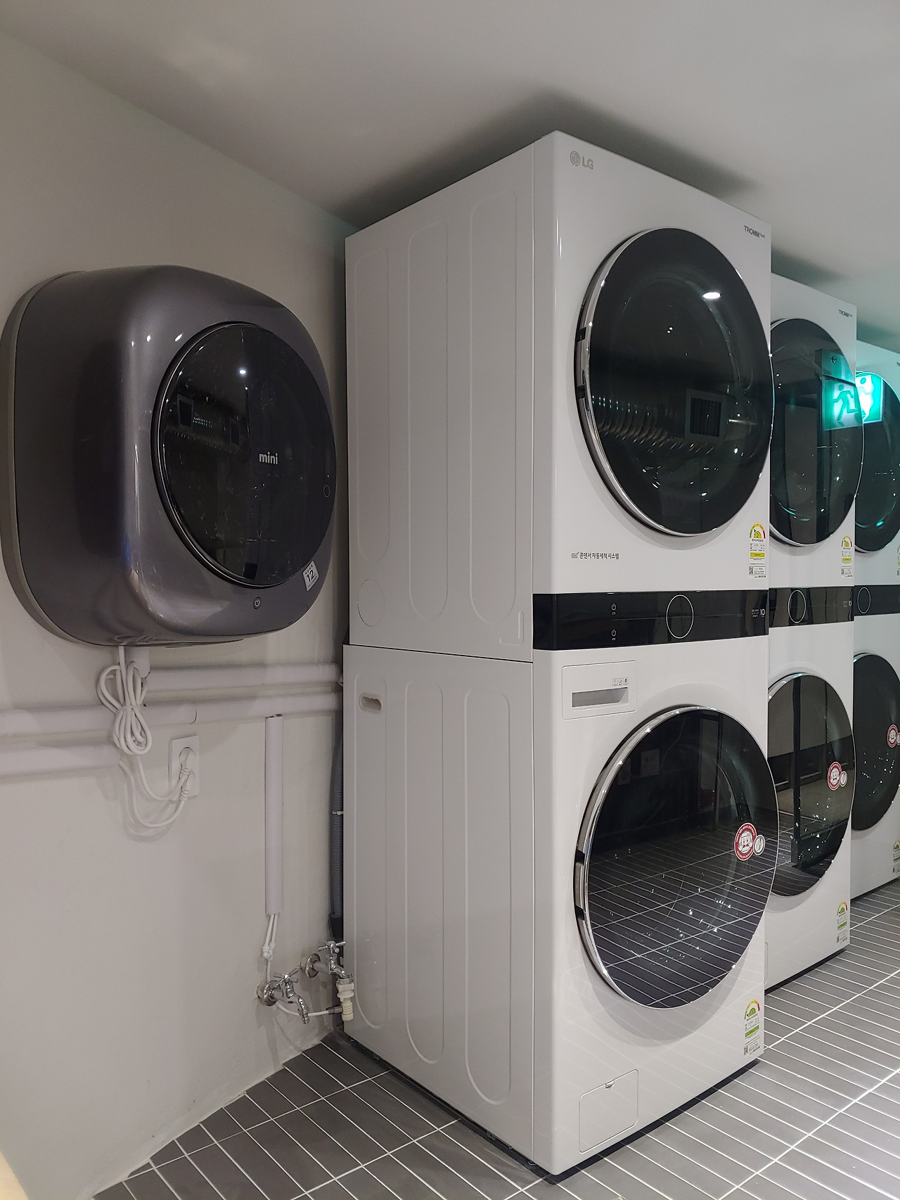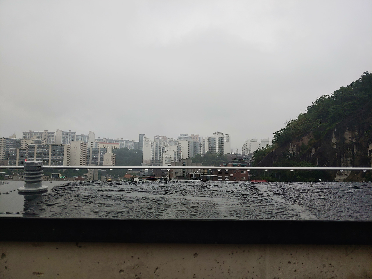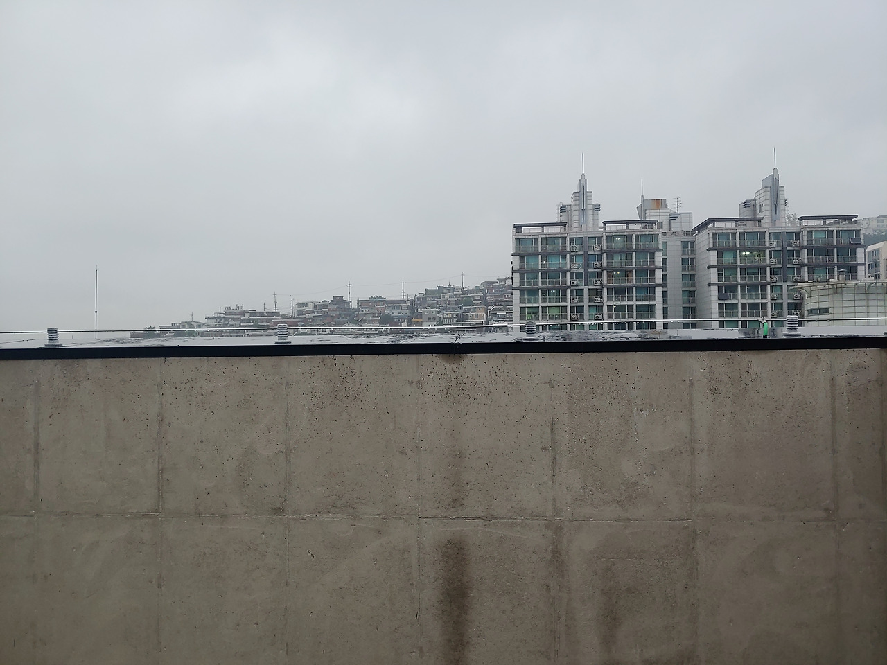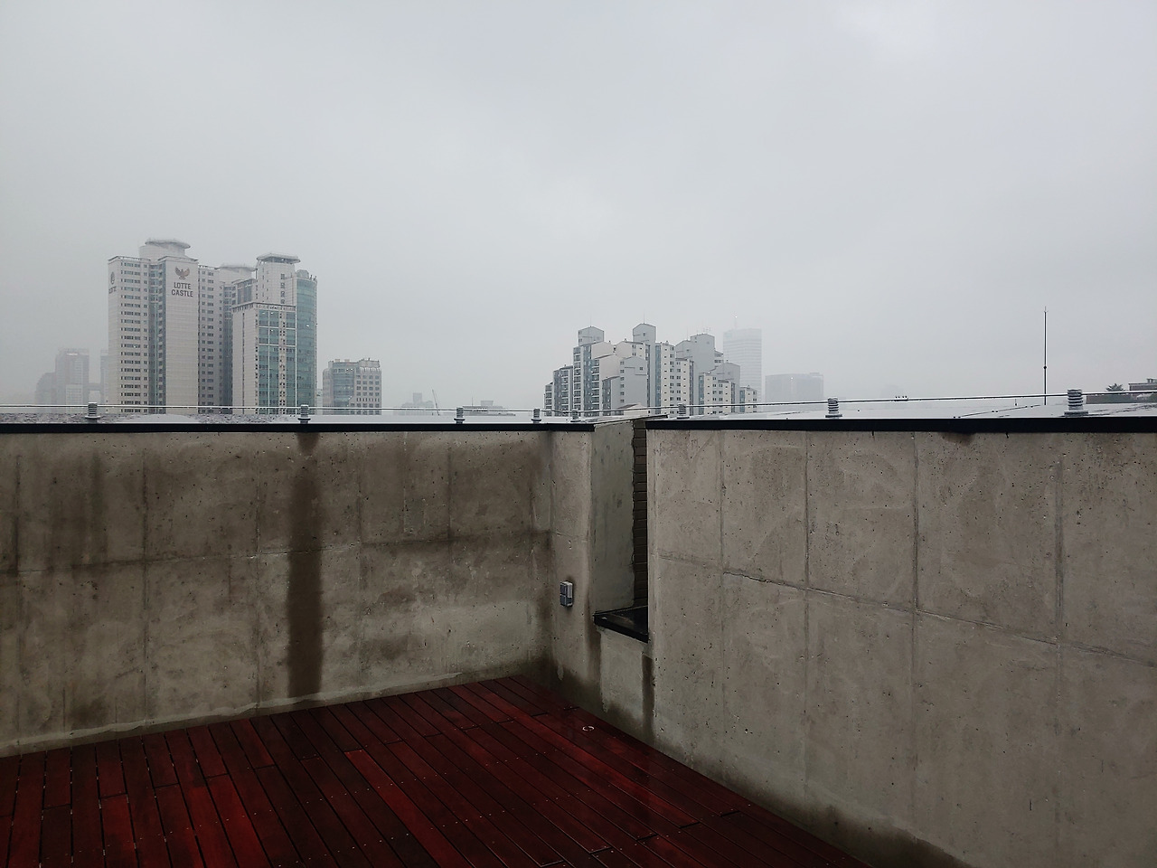 #4. 부담 없는 공용공간.가끔 임대주택을 방문했을 때 드는 생각 중에 하나는 과한 부분이 있다는 점이다. 특히 공용공간에 잔뜩 힘을 준 경우가 많은데 맹그로브의 공용공간에서는 그럼 부담은 확실히 덜했다. 도착해서 우선 옥상 테라스부터 먼저 보고 내려왔는데 뷰도 좋고, 비오는 날이라 그런지 운치가 있었다. 옥상 테라스에는 그릴을 즐길 수 있는 공간도 있었다. 그리고 예약제로 사용할 수 있는 헬스장, 업무 공간 및 카페로 사용할 수 있는 일층 공간, 지하에 마련된 부엌과 빨래실 등 실용적이면서도 과하지 않다는 생각이 들었다.