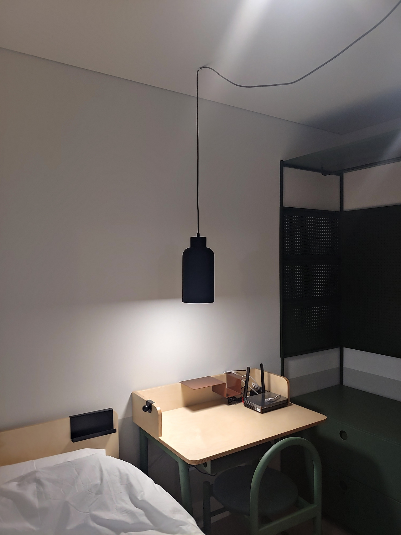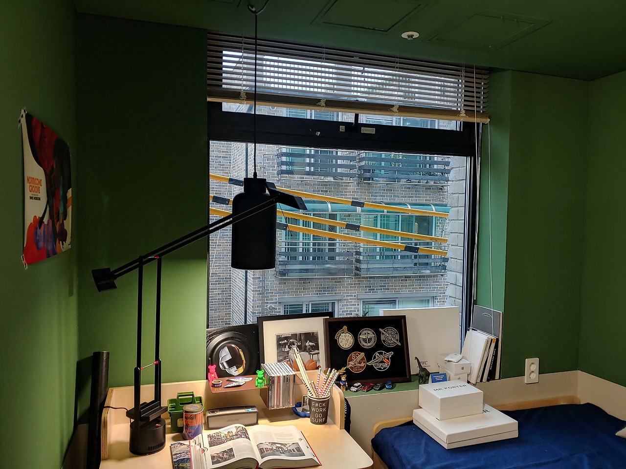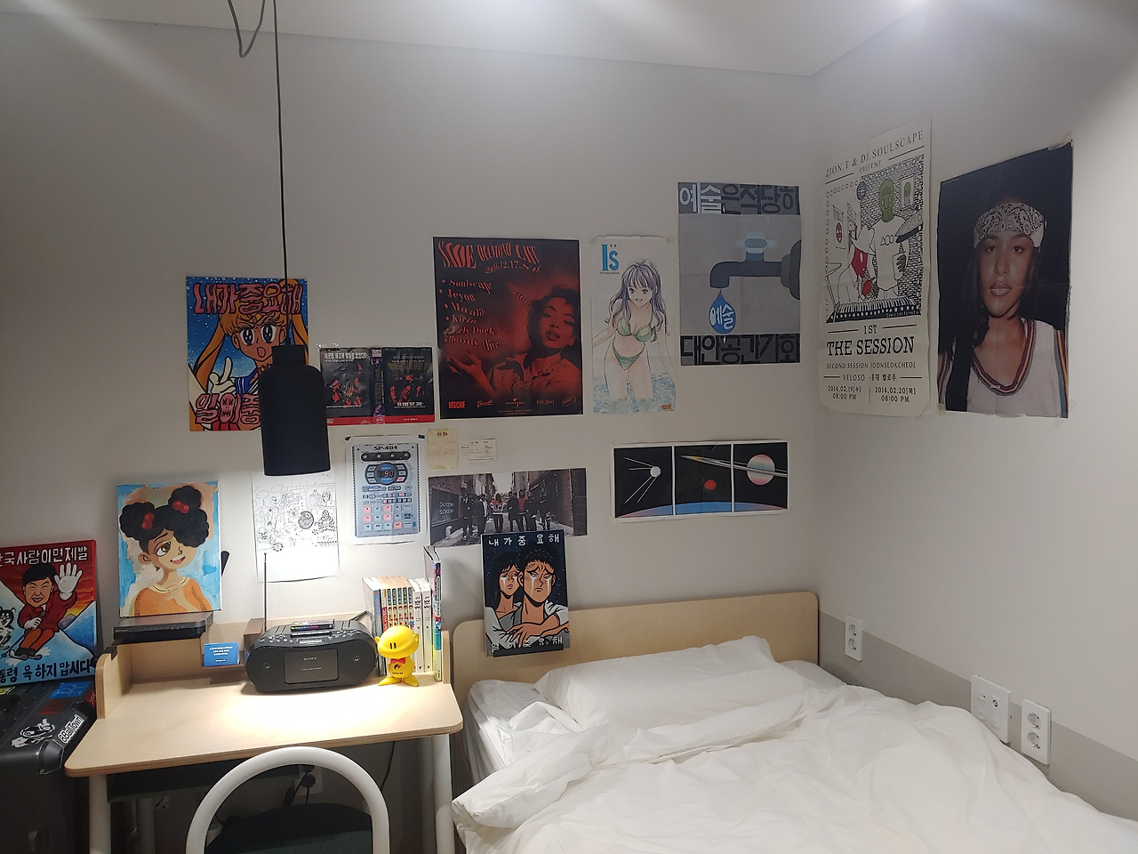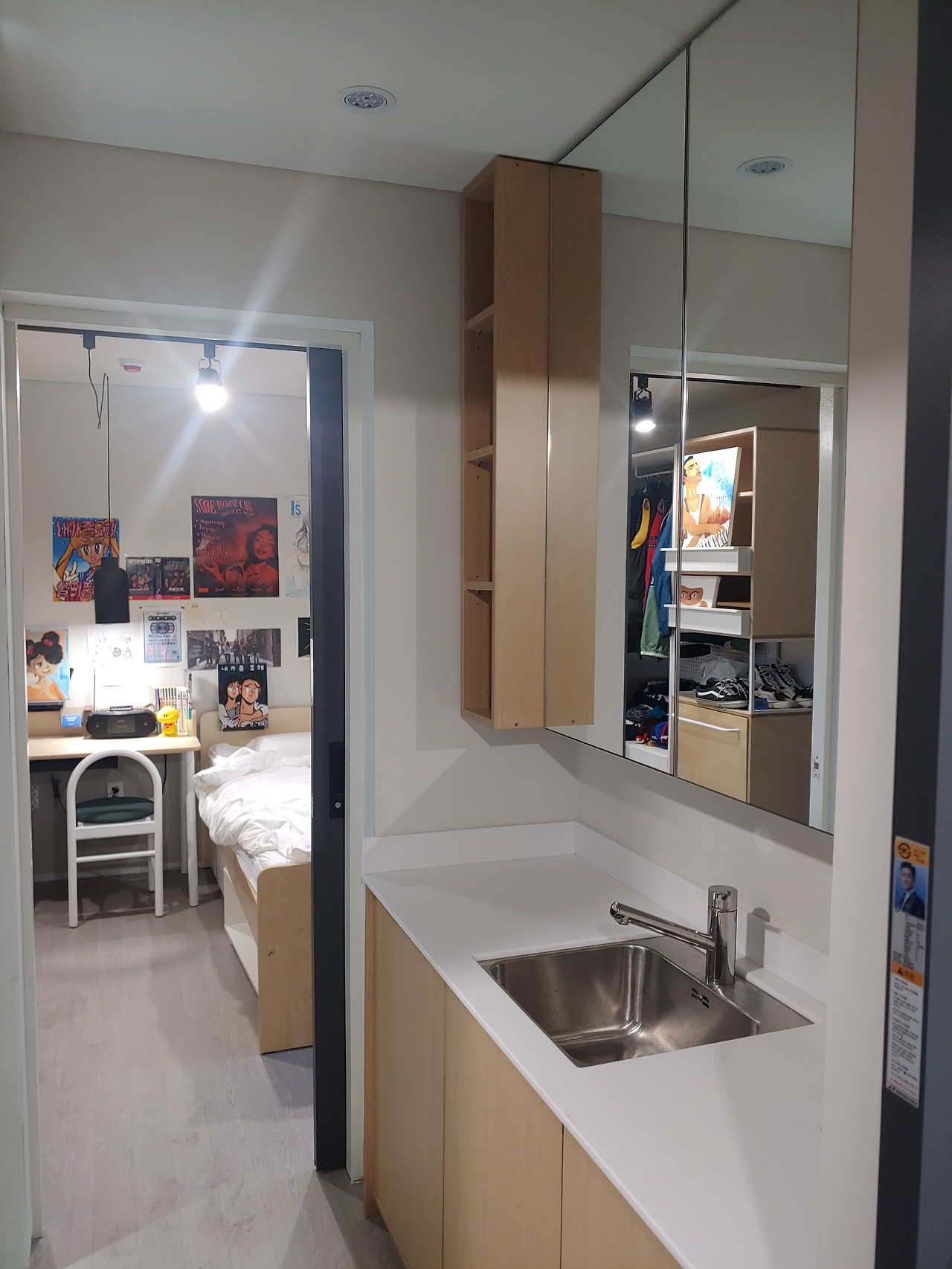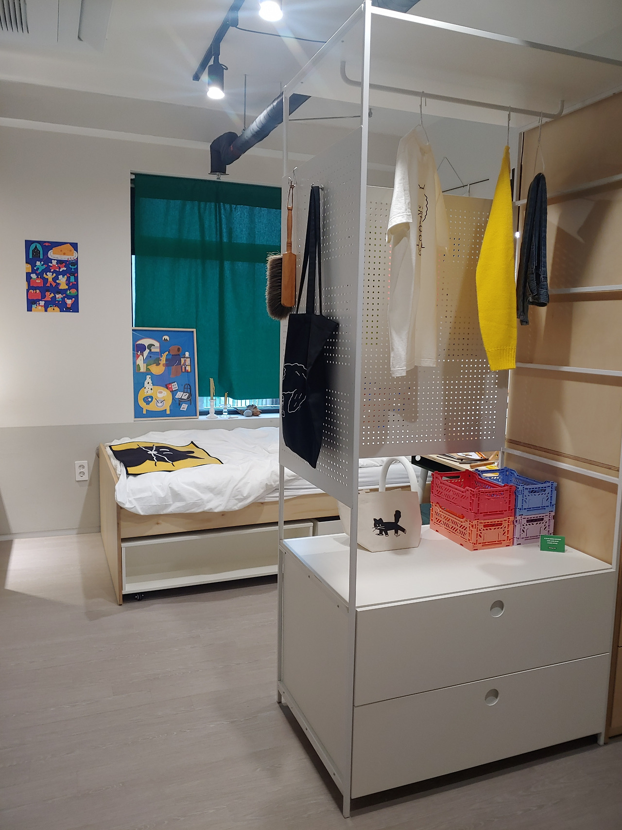 #3. 협주와 변주. 방에 들어가자마자 가구가 눈에 들어왔다. 자체 제작한 가구라고 한다. '비아인키노'와 협업을 통해. 비아인키노는 팟캐스트에도 한번 나와 얘기를 나눈 적이 있는데 가격이 싸지는 않다. 비아인키노에서 맹그로브가 추구하는 방향성(청년들에게 합리적인 가격에 살고 싶은 공간을 제공하는)에 공감해 함께 작업을 했다고 한다. 다른 임대주택에서 보지 못했던 아이디어도 있었다. 2인 1실이라고 해야할까. 각자 독립적인 공간(침실+책상 등)이 있고, 화장실과 샤워실을 공용으로 쓰는 방이다. 두 방과 공용 공간은 연결되어 있고, 각각 개별 테라스도 있다. 연인이나 친한 친구들이 이 공간을 같이 쓰면 좋을 것 같다.