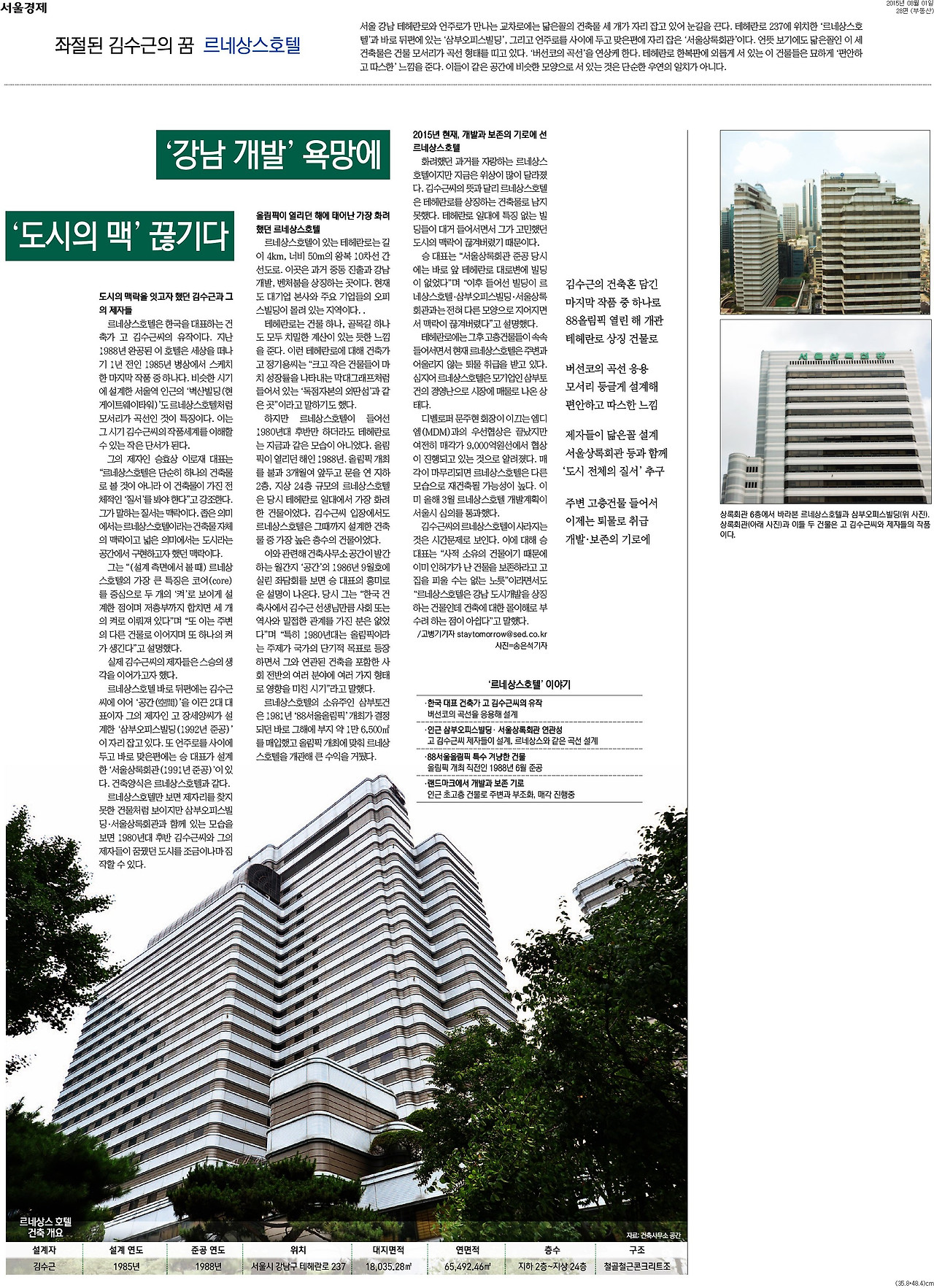 르네상스호텔 매각이 한창 추진되고 있을 당시 쓴 기사다. 개발과 보존의 기로에 선 르네상스호텔을 기록하기 위해 썼다. '건축과 도시' 시리즈의 시작이기도 하다. 르네상스호텔은 건축가 김수근 씨의 후기 작품인데 기록이 거의 남아 있지 않아 취재가 쉽지 않았다. 대학 도서관에서 일하고 있는 학교 선배들의 도움을 많이 받았다. 선배들을 통해 건축 잡지 '공간'의 과거 자료들을 찾아 거기 실린 김수근 씨 제자들의 대담을 보면서 르네상스호텔을 설계하던 당시 김수근 건축과의 생각을 이해하려고 애를 썼다. 김수근 씨의 제자인 승효상 건축가와의 인터뷰도 도움이 됐다. 현재 르네상스호텔이 있던 자리는 한창 재개발이 진행 중이다.