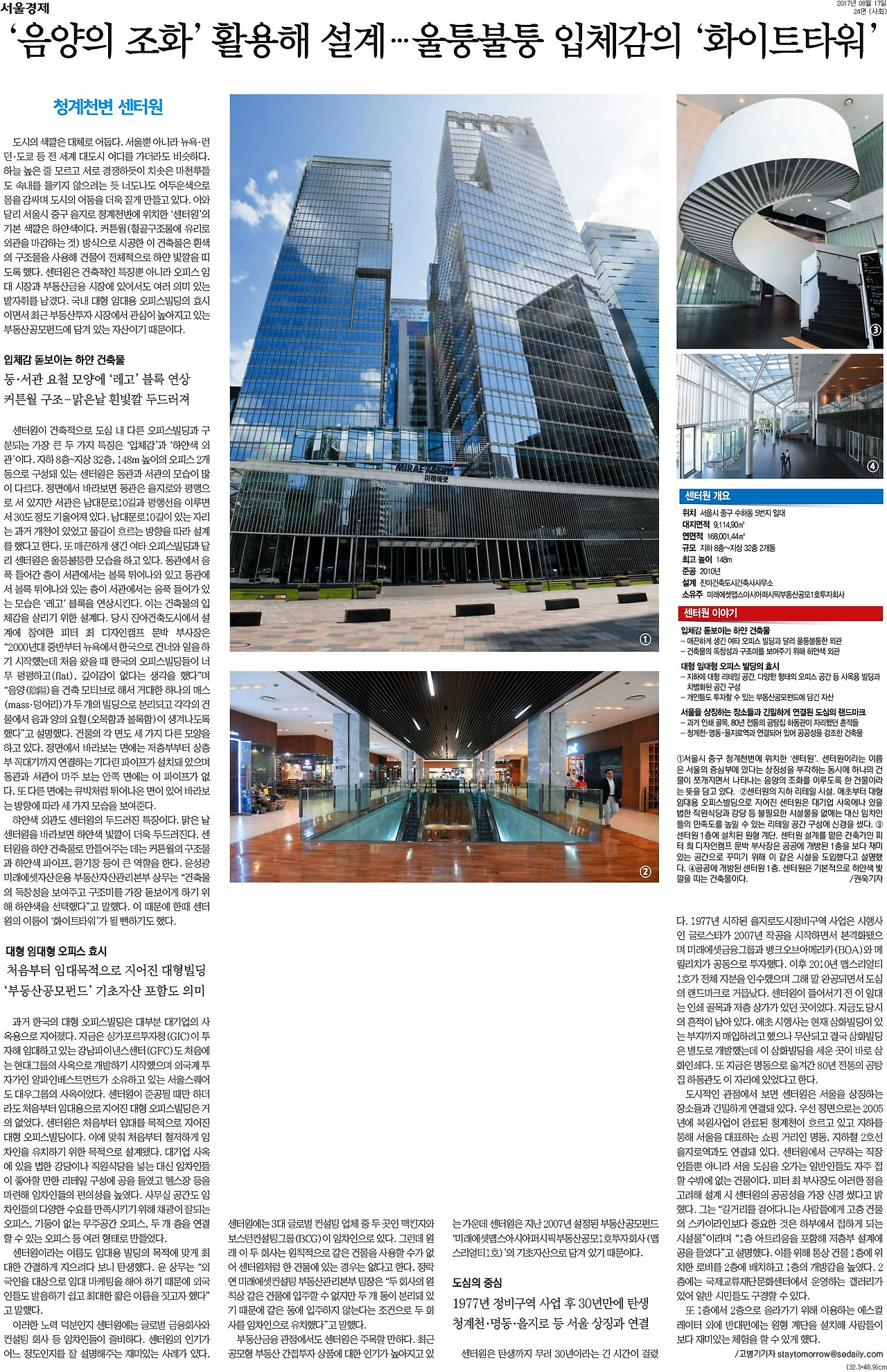 4대문 안에는 쌍둥이 빌딩이 많다. 남산 경관을 가리지 않도록 건축 규제가 적용되기 때문이다. 센터원도 규제를 적용 받아 쌍둥이 빌딩으로 지어졌다. 근데 쌍둥이 빌딩의 경우 규모에 비해 로비가 옹색한 경우가 많다. 센터원의 경우 이 같은 문제를 해결하기 위해 저층부를 통합해서 지었다. 덕분에 다른 쌍둥이 빌딩의 로비 보다는 웅장한 느낌을 준다. 센터원 시행에 참여했던 이들이 시행한 종각역 인근 센트로폴리스 저층부 로비가 통합된 것도 그런 이유다. 센터원의 기본 컬러는 화이트다. 커튼월 방식이라 대충보면 잘 모를 수도 있지만 커튼월의 구조물과 하얀색 파이프 덕분에 하얀 빛깔을 띈다.