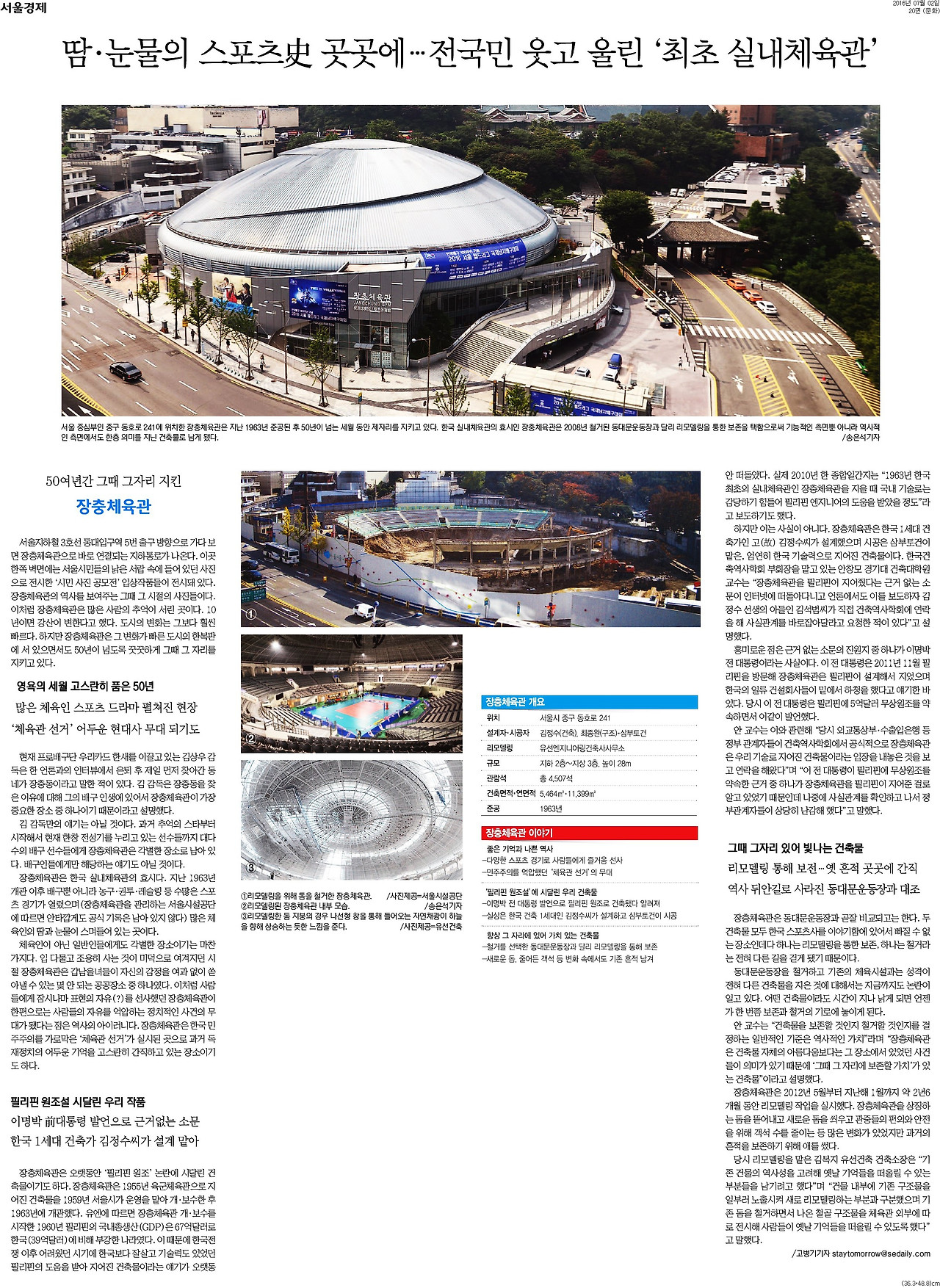 "여기는 장충체육관입니다." 배구 중계 때문에 친숙한 건물이다. 한국 배구계의 숱한 역사가 이 곳에서 쓰여졌다. 그 기원을 정확하게 알 수 없는 건축물이기도 하다. 스포츠를 좋아해서 해외 여행이나 출장을 갈 때 마다 꼭 메이저리그 야구장이나 NBA농구장, 프리미어리그 축구장을 찾고는 한다. 스포츠 경기장도 꼭 한 번 다뤄보고 싶은 주제였다. 장충체육관 리모델링을 맡았던 건축 사무소의 도움을 받아 취재를 했다.