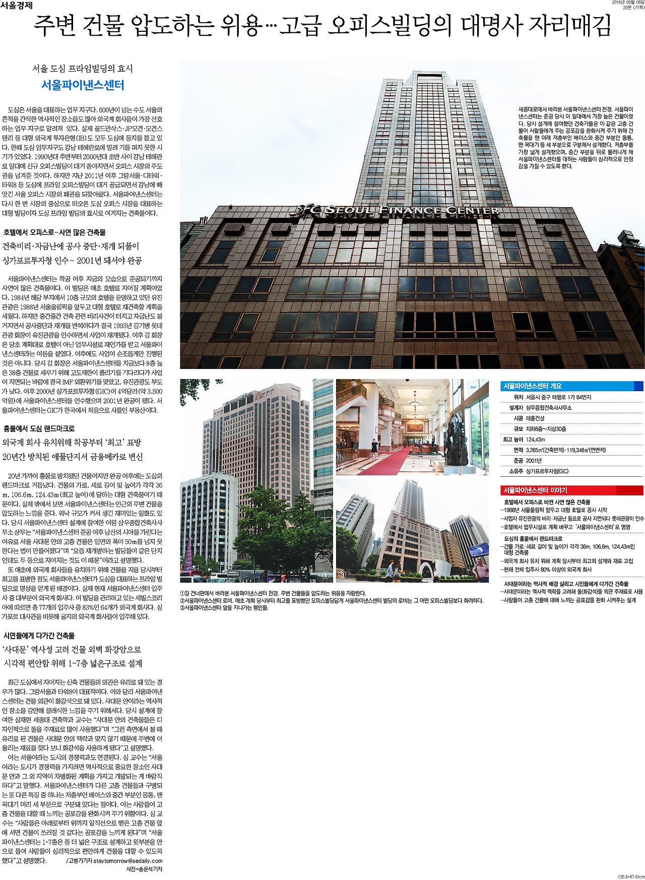 IMF 외환위기의 역사와 뗄래야 뗼 수 없는 건축물이다. 강남파이낸스센터는 애초 대기업 사옥으로 개발될 예정이었으나 IMF로 인해 사모펀드 운용사 론스타에 매각되고, 이후 싱가포르투자청이 인수해 지금까지 소유하고 있는 건축물이다. 건축적 특징만으로는 이 건물을 이해할 수 없다. 싱가포르투자청과 강남파이낸스센터 인수 경쟁을 벌였던 삼성생명 관계자 등을 인터뷰해서 기사를 썼다.