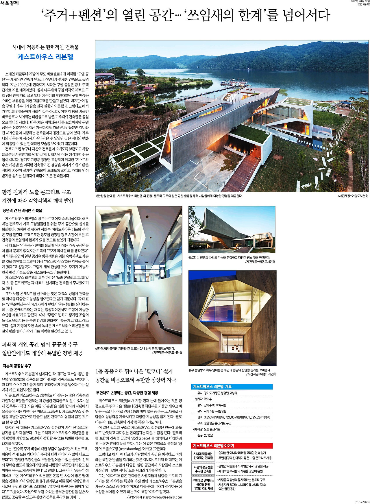 건축과 도시를 쓰면서 유일하게 직접 현장에 가보지 못하고 쓴 건축물이다. 여러가지 일로 바빴고, 취재 대상을 정하는데 시간이 오려 걸려서 부득이하게 현장을 찾지 못했던 기억이 난다. 설계를 맡은 곽희수 건축가를 한남동 사무실에서 만나 인터뷰를 하고 기사를 썼다. 비록 현장 취재는 못했지만 곽희수 건축가를 알게 됐다는 점에서 의미는 있었다.