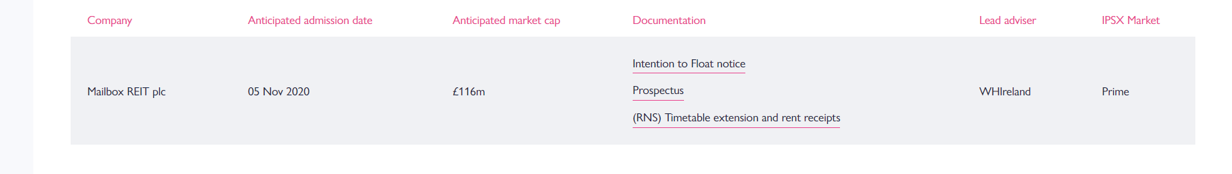 #메일박스 리츠가 눈길을 끄는 이유는 또 있다. 그간 영국 리츠는 전부 LSE는 상장되었지만 메일박스 리츠는 IPSX에 상장된다. IPSX는 리츠와 같이 상업용 부동산을 기초자산으로 하는 주식을 전문적으로 거래할 수 있는 거래소로 이러한 형태의 거래소는 세계 최초라고 한다. 또한 IPSX는 영국 금융당국 FCA(Financial Conduct Authority)의 통제를 받는다. IPSX는 IPSX프라임과 기관투자자 전용인 IPSX훌세일 두 개의 시장을 운영하며, 메일박스 리츠는 IPSX프라임에 상장할 예정이다. 메일박스 리츠는 IPSX에 상장하는 최초의 리츠가 된다.