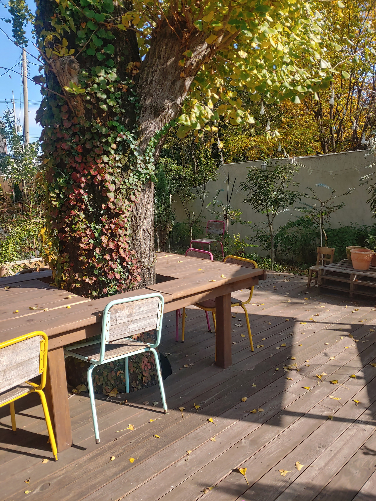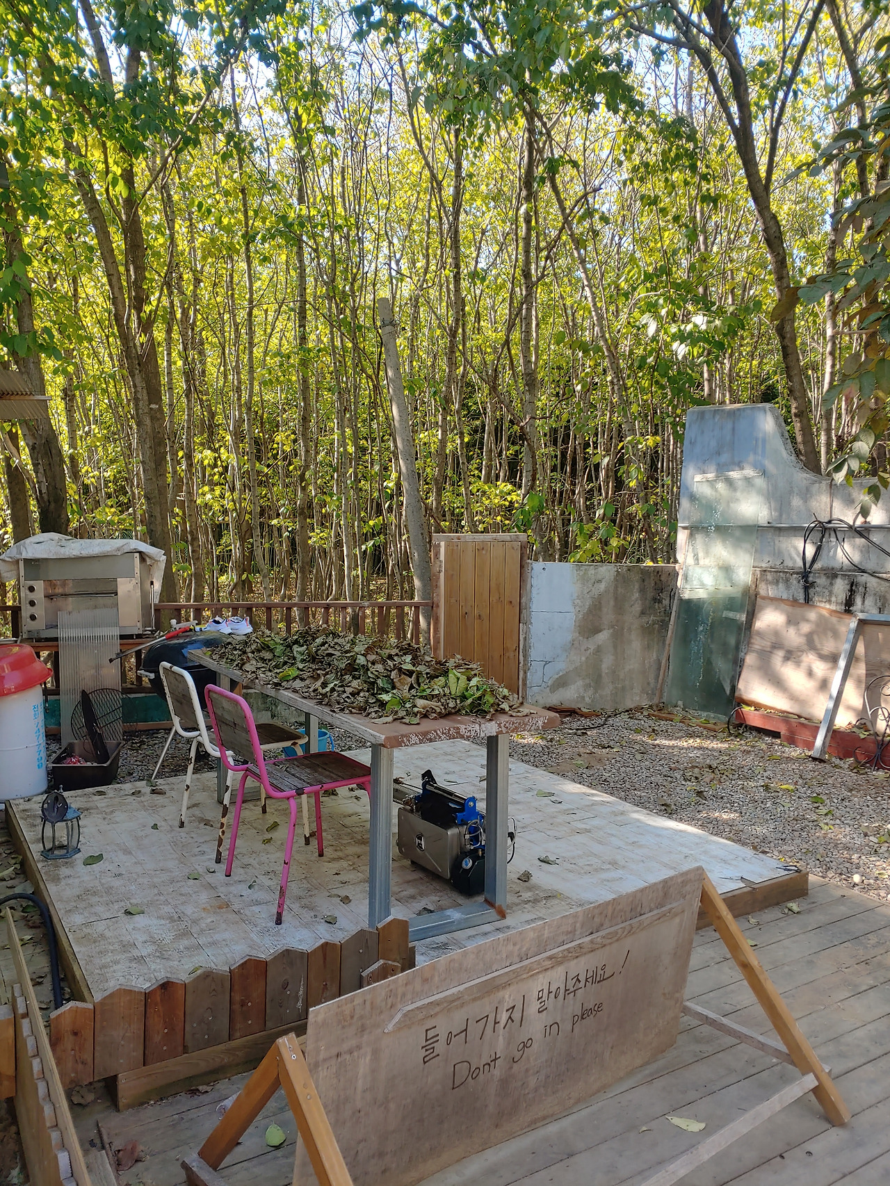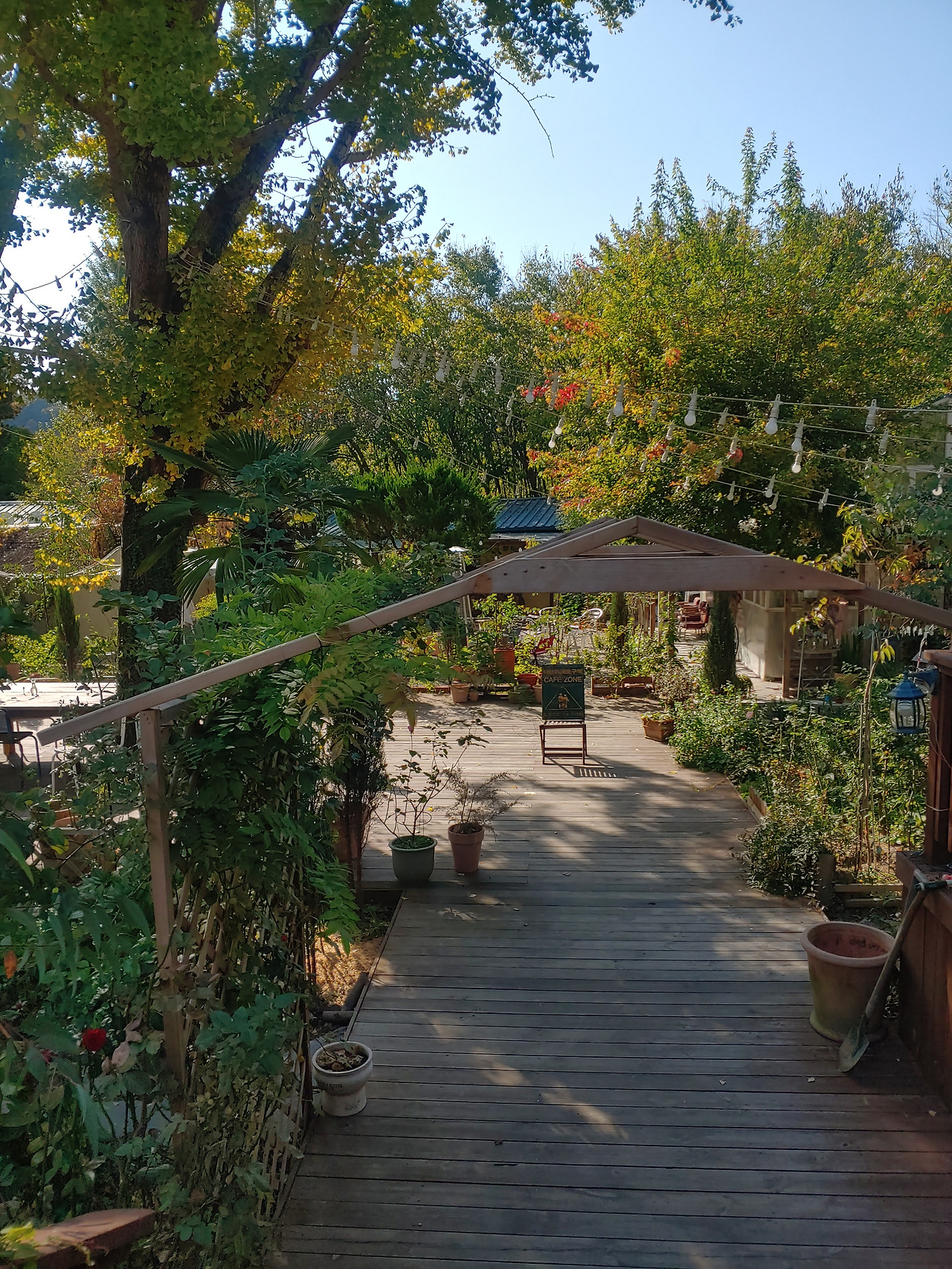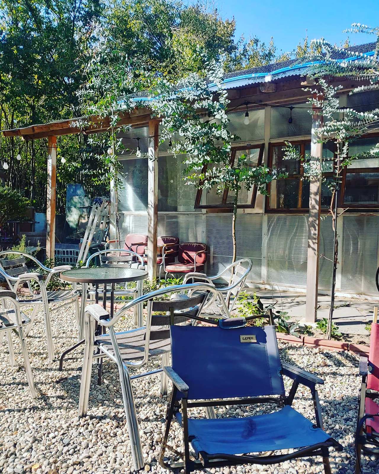 윔블던에서 주인공인 남자 테니스 선수 부모님 댁에 아버지가 오두막을 짓고 사는 정원이 나오는데 영화 속 그 장면이 떠올랐던 진주의 카페