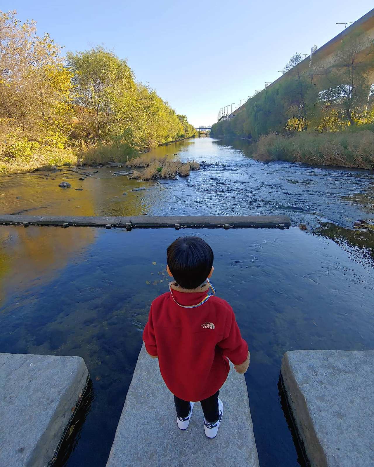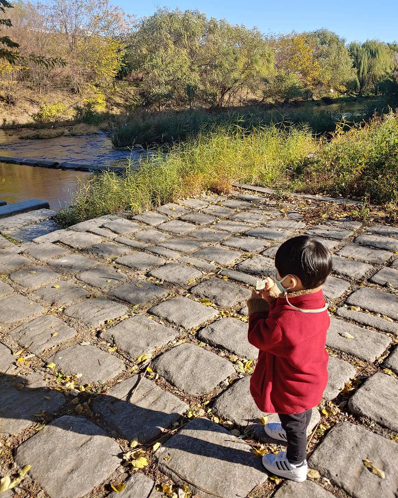 다행히도 일요일 서울 공기는 깨끗했다. 그런데 날이 갑자기 추워져 멀리는 못 가고 아파트 단지 놀이터에서 놀고, 같이 걷는데 말라버린 단지 내 물 웅덩이를 보고 네가 무척 아쉬워했다. 요즘 돌을 주워 물에 던지는 데 재미를 붙인 너다. 그래서 10분 정도 걸어 냇가로 데리고 나갔다.