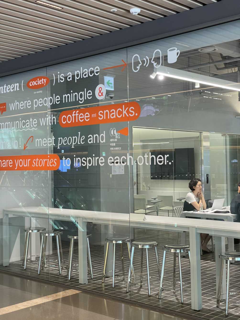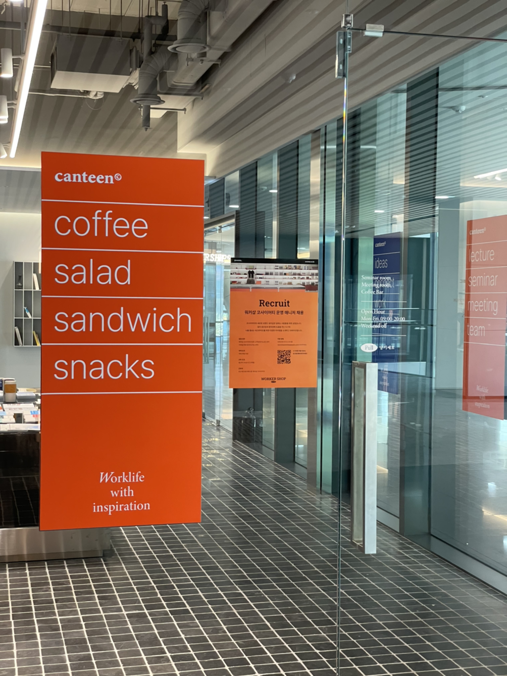 판교에 등장한 코사이어티. 성수동 코사이어티가 제주에 이어 이번에는 판교로 왔다. 지난해 코사이어티를 운영하는 이민수 언맷피플 대표님을 인터뷰 하면서 이 프로젝트에 대해 들었는데 판교에 온 김에 보고 왔다. 사실 다음주에 이 대표님을 여기서 뵙기로 했는데 온 김에 보고 다음주 만남은 성수동에서 갖기로. 판교 코사이어티는 구내식당 역할을 하는 카페 '캔틴(Canteen)'과 사무용품과 와인 등 일하는 사람들이 필요한 물품을 파는 '워커 숍(Worker Shop)', 각종 행사와 모임을 할 수 있는 '타운홀' 등으로 구성되어 있다. 이 대표님이 이 인터뷰에 대해 설명하면서 오피스 건물 저층부 리테일에서 가장 애매한 공간인 3층, 주로 병의원 등이 들어서는 3층을 다르게 만들어보고 싶다고 했던 기억이 난다.